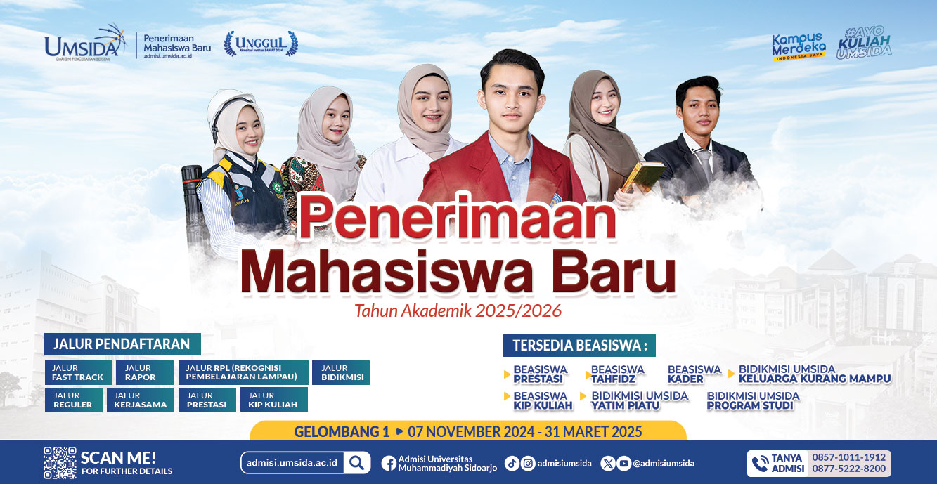 PMB Umsida 2025 Telah DibukaSebagai Perguruan Tinggi yang unggul dan inovatif, Umsida menjadi pilihan tepat yang memberikan pendidikan secara profesional untuk mencetak generasi hebat dan menemukan minat di bidang IPTEKS berlandaskan nilai islam