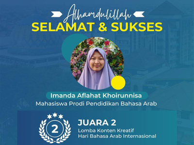 Umsida.ac.id– Imanda Aflahat Khoirunnisa berhasil raih Juara 2 lomba Konten Video Kreatif Bahasa Arab yang mengusung tema Kreativitas yang Positif. Kompetisi ini diselenggarakan oleh Himpunan Mahasiswa Prodi Pendidikan Bahasa Arab IAIN Ambon dalam rangka memperingati Hari Bahasa Arab Sedunia.